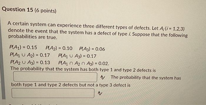 PA 1 A 2 013. Suppose that the following probabilities are true. A certain system can experience three different types of defects. Let Aii 5 123 denote the event that the system has a defect of type i. Get Your Custom Essay on. PA 1 A 2 A 3 001. A certain system can experience three different types of defects.